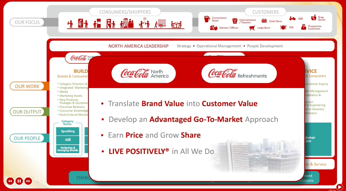 Profound changes within the client’s organizational structure necessitated the development of a complex operating model. Because of the intricacies of the structure, as well as the politics involved, the client wanted to create a full-featured interactive explanation of the new structure. We developed a Flash-based experience that told the story linearly and demonstrated how the model was built, explaining the model’s rationale and how it was derived from core company values and strategies. In addition, a fully interactive model was created to allow the user to explore the model, drilling down to find more in-depth information and resources on their areas of interest.